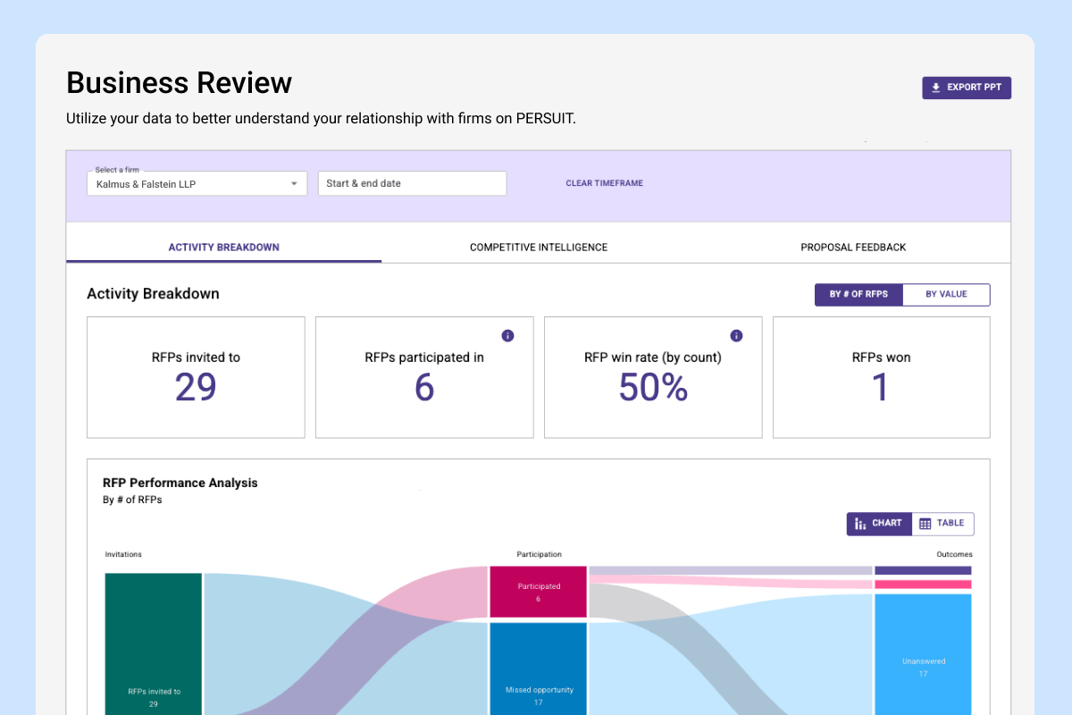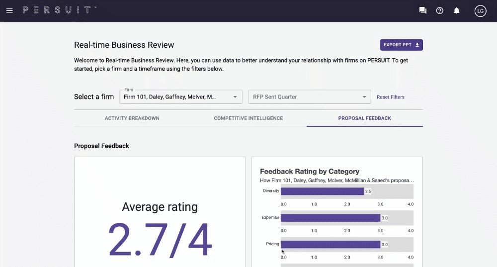 The Proposal Feedback area empowers you to see the quantitative and qualitative data behind all or individual RFPs. Instead of going back through requests trying to make sense of how a firm could improve their proposal, this page brings all your data together in one place. Two key reports in Proposal Feedback are: