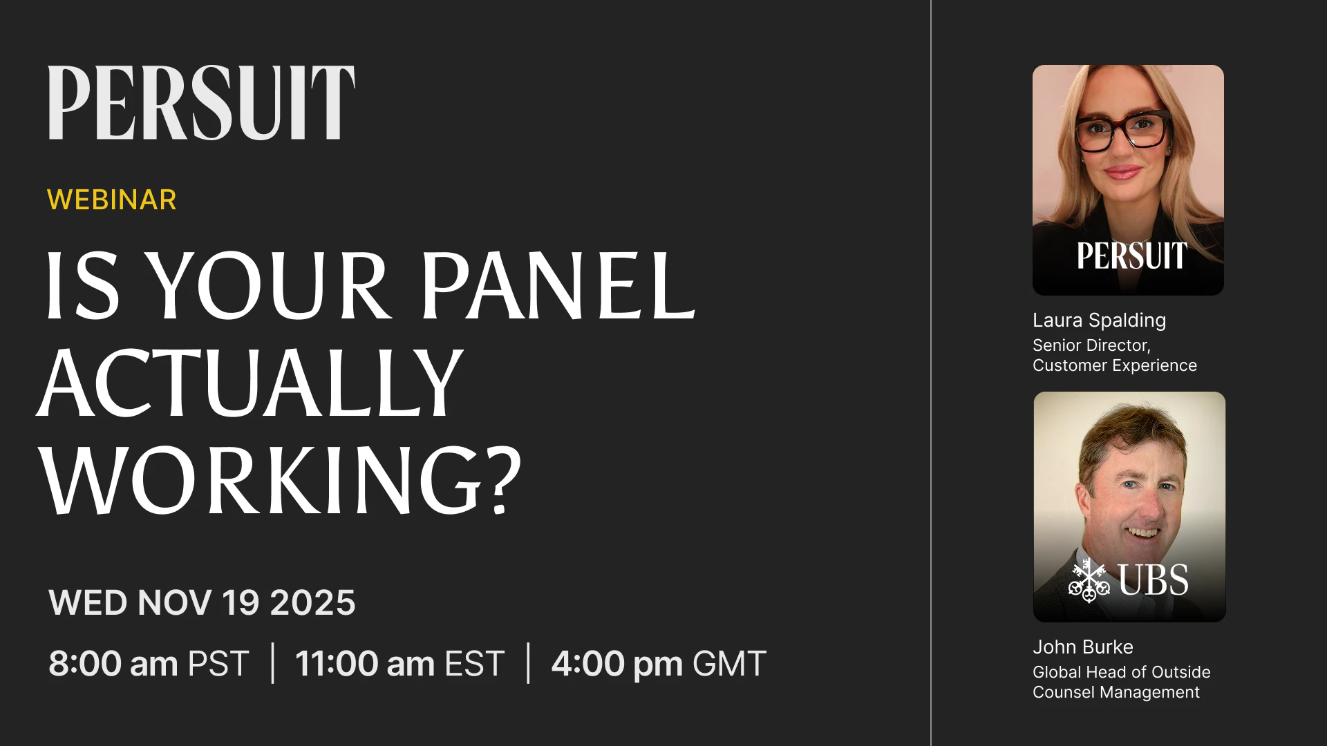 That’s why we’re hosting a webinar with John Burke, Head of Outside Counsel Management at UBS, and Laura Spalding, Head of Customer Experience, PERSUIT on November 19.