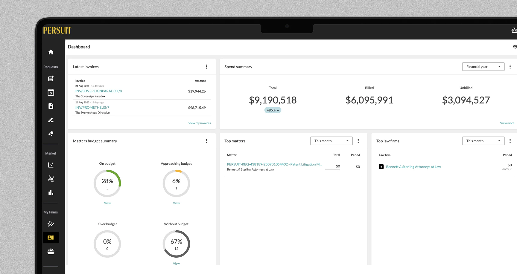 Oversight without insight just adds noise. PERSUIT gives you full visibility into your legal spend, tying every dollar back to outcomes so you can plan with confidence, eliminate waste, and show the business how smarter spend drives measurable value.