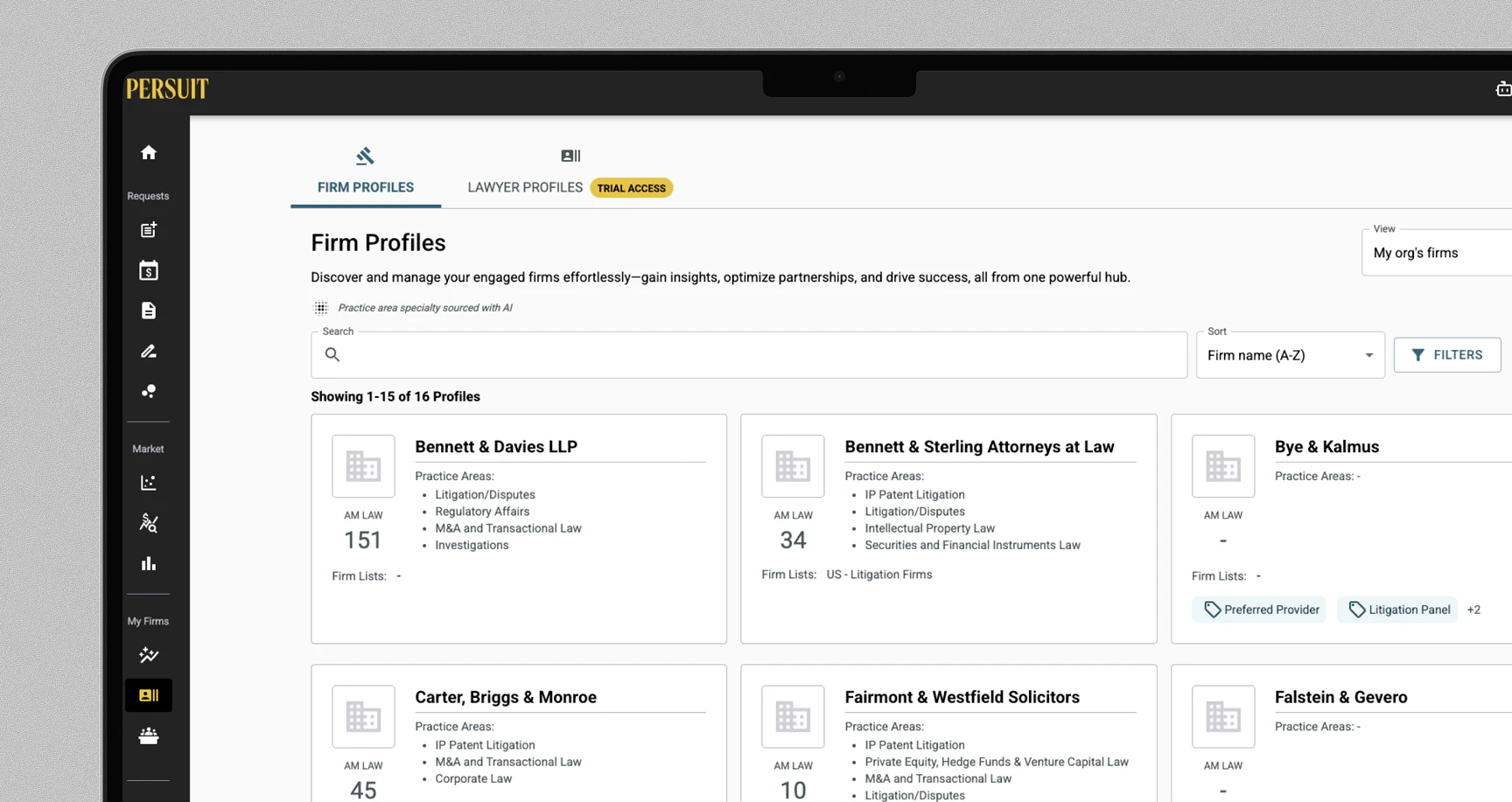 Stop relying on anecdotes or old relationships to pick the right firm. PERSUIT gives you a data-backed view of your panel and beyond so you know exactly who to engage for each matter, and why. Compare performance, rates, track spend, and capture feedback, all in one hub that turns panel oversight into a strategic advantage.